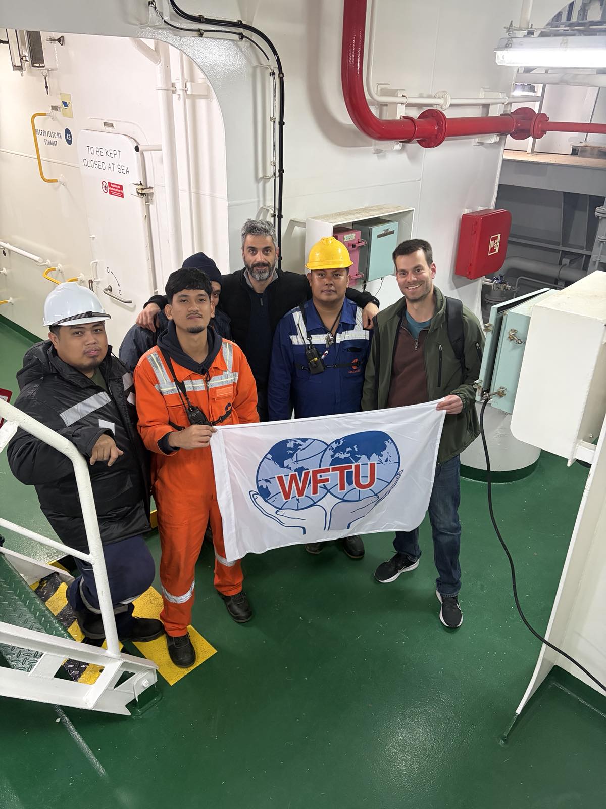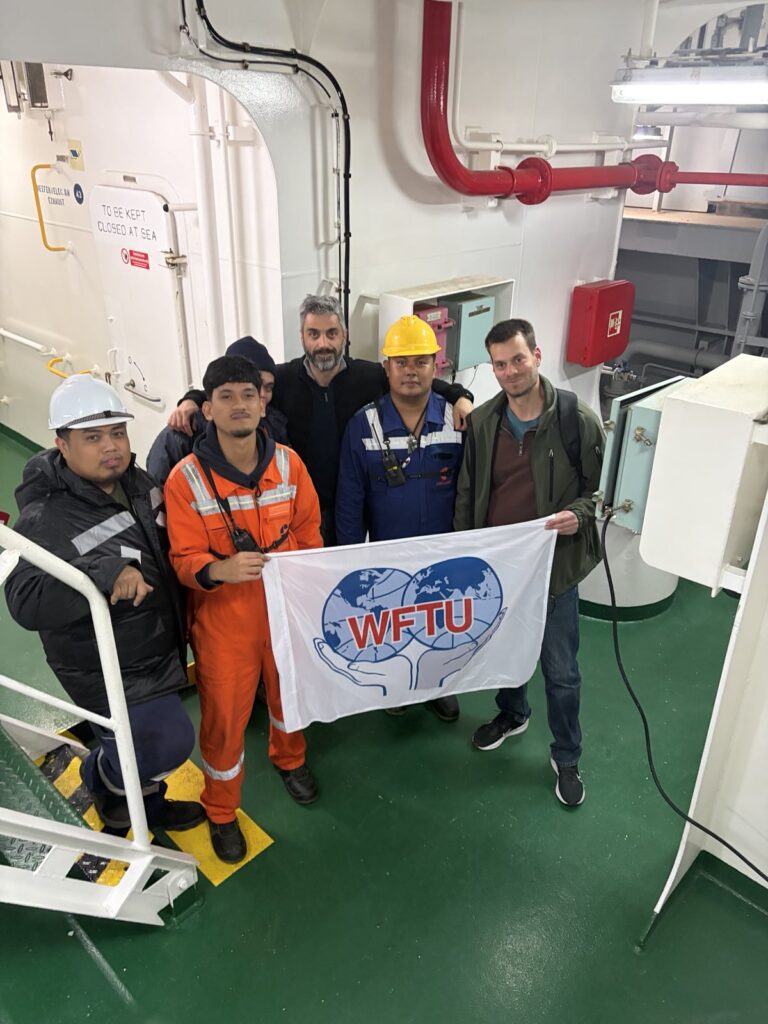 Τα σωματεία μας ΠΕΜΕΝ και ΣΤΕΦΕΝΣΩΝ, με αντιπροσωπεία της Παγκόσμιας Συνδικαλιστικής Ομοσπονδίας (ΠΣΟ) και ναυτεργάτες, επισκέφτηκαν πλοίο κοντέινερ, στην COSCO, στο πλαίσιο της 24ωρης Πανελλαδικής Προειδοποιητικής Απεργίας στις 5 Μάρτη, σε όλες τις κατηγορίες πλοίων, με κύρια αιτήματα τον απεγκλωβισμό και ασφαλή επαναπατρισμό των ναυτεργατών που είναι εγκλωβισμένοι στον Περσικό Κόλπο και το χαρακτηρισμό σε Εμπόλεμες Ζώνες, όλων των θαλάσσιων περιοχών που μαίνονται πολεμικές συγκρούσεις.