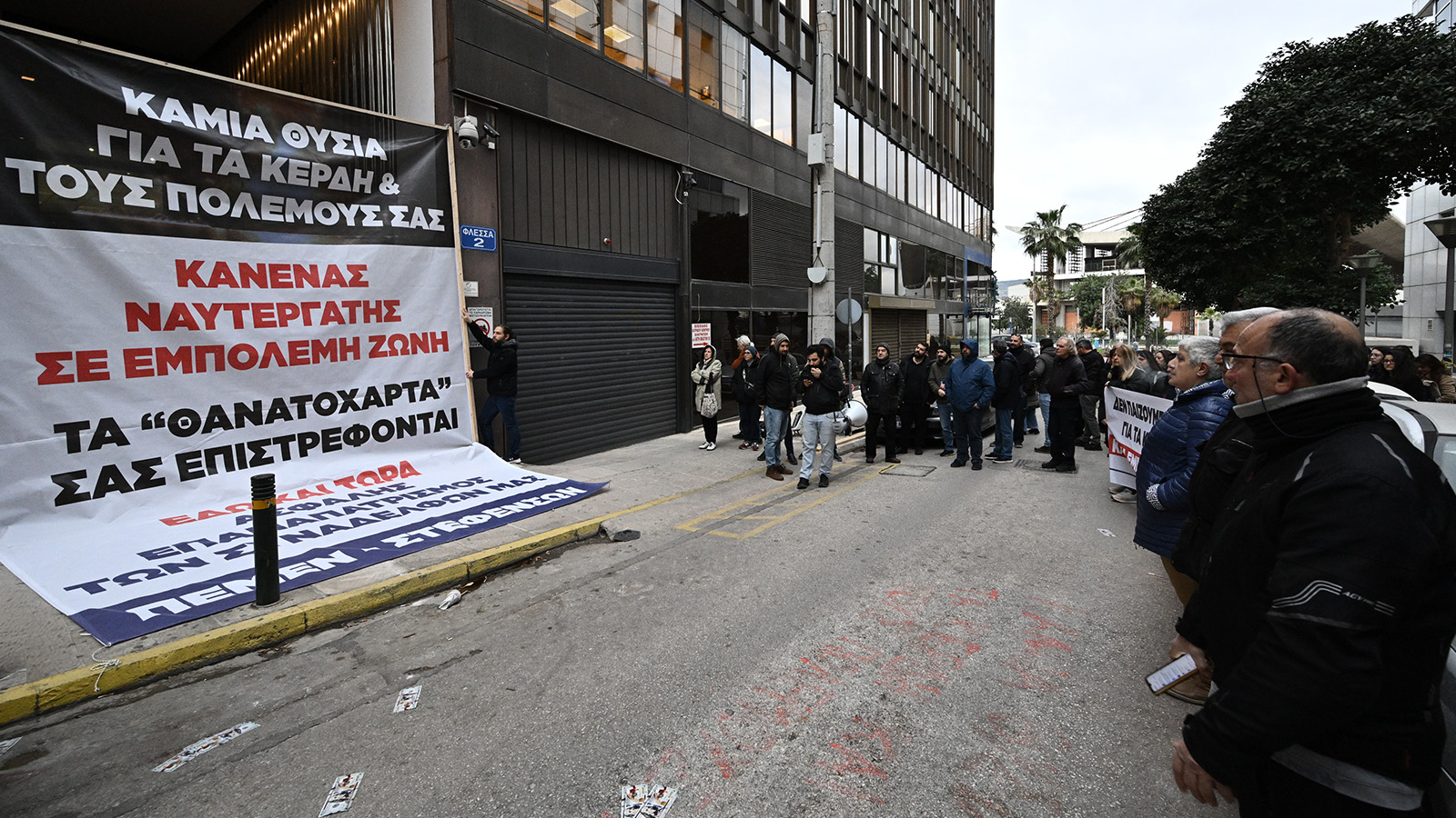 «Καμία θυσία για τους εφοπλιστές – Οι ναυτεργάτες έχουμε ζωές» ακούστηκε δυνατά από την συγκέντρωση κάτω από τα γραφεία όπου τα παράσιτα των εφοπλιστών μετράνε τα κέρδη τους και παραγγέλνουν τα θανατόχαρτα από τους ναυτεργάτες για να τους στέλνουν μέσα στο μακελειό.