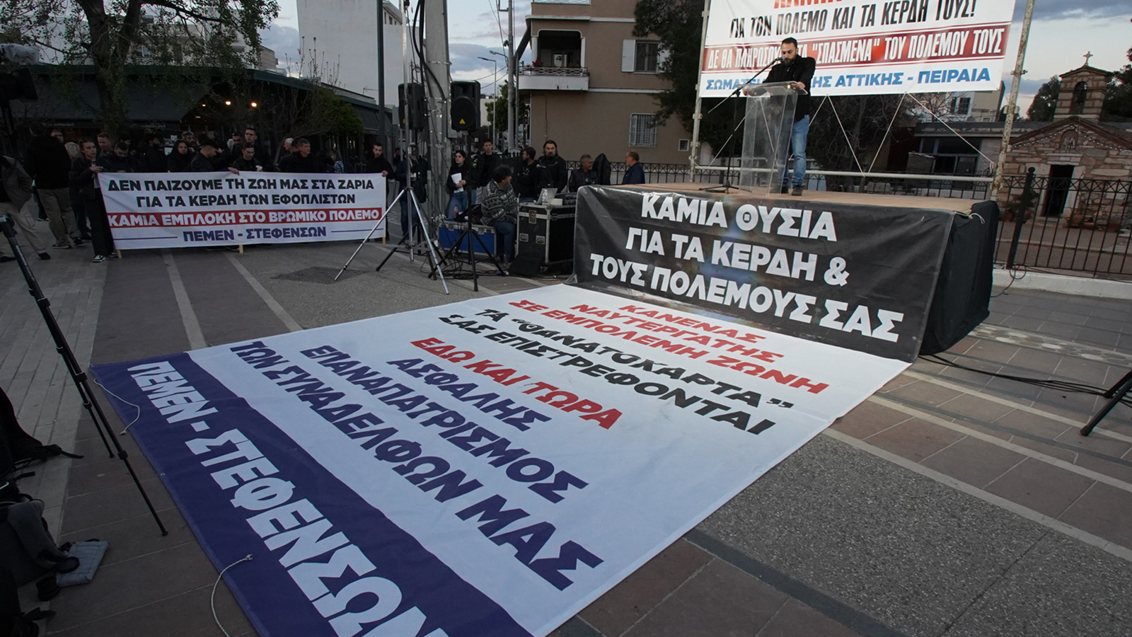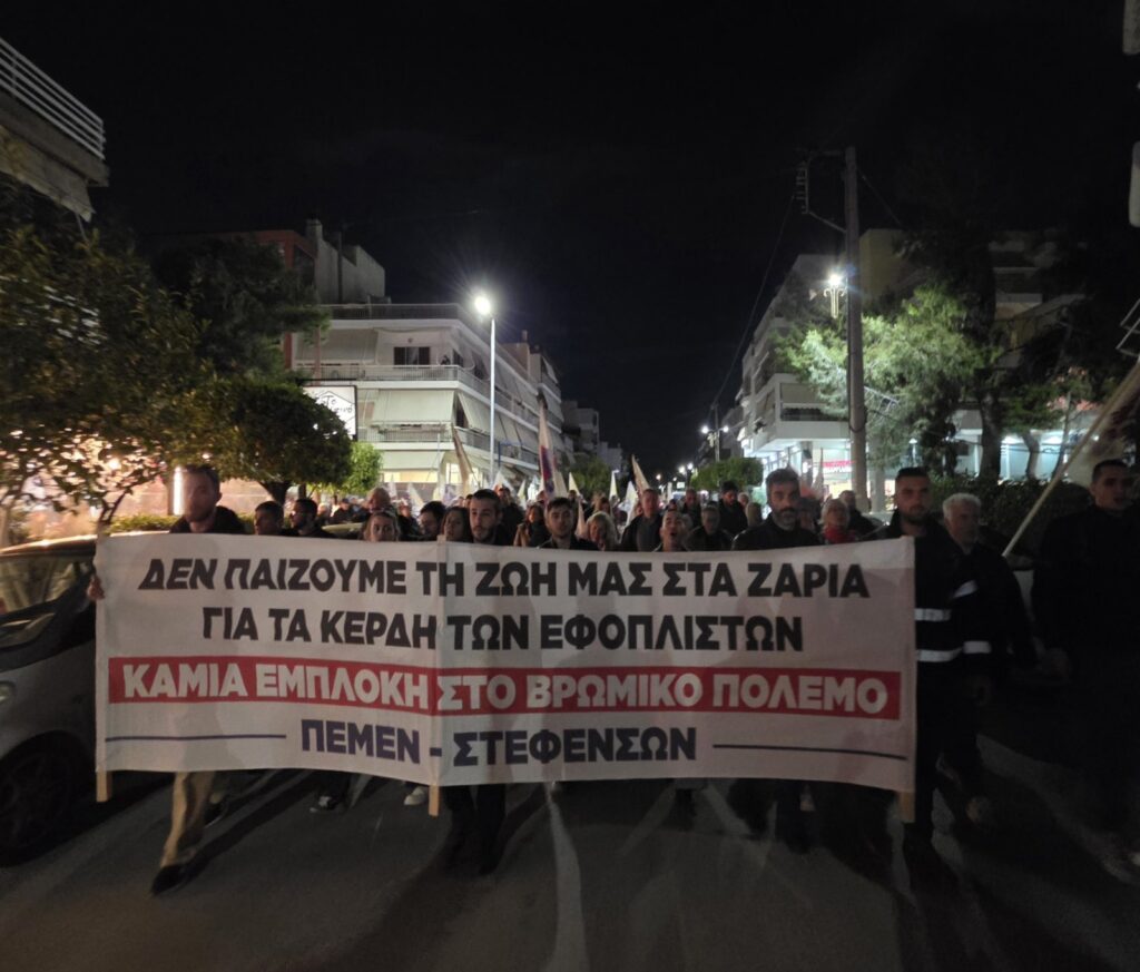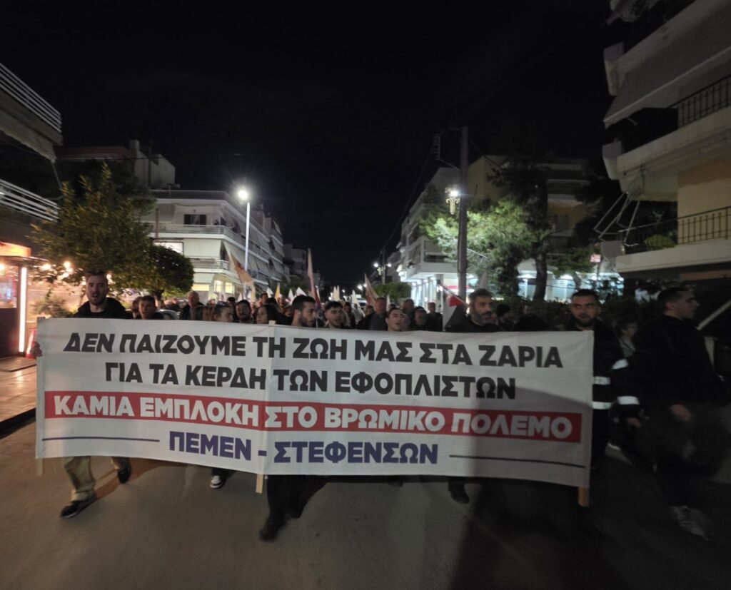 «Καμία θυσία για τα κέρδη και τους πολέμους τους! Έξω τώρα η Ελλάδα από τον πόλεμο! Δεν θα πληρώσουμε εμείς τα “σπασμένα”!», διαμηνύουν τα σωματεία και φορείς, δίνοντας με την κινητοποίησή τους ακόμα μια μαζική απάντηση στην πολεμική εμπλοκή της χώρας και την μετακύλιση των συνεπειών στο λαό, την ίδια μέρα που διεξήχθη στην Ελευσίνα η άσκηση που επιβεβαιώνει στην πραγματικότητα τον κυκεώνα κινδύνων για τους εργαζόμενους και τις οικογένειές τους.