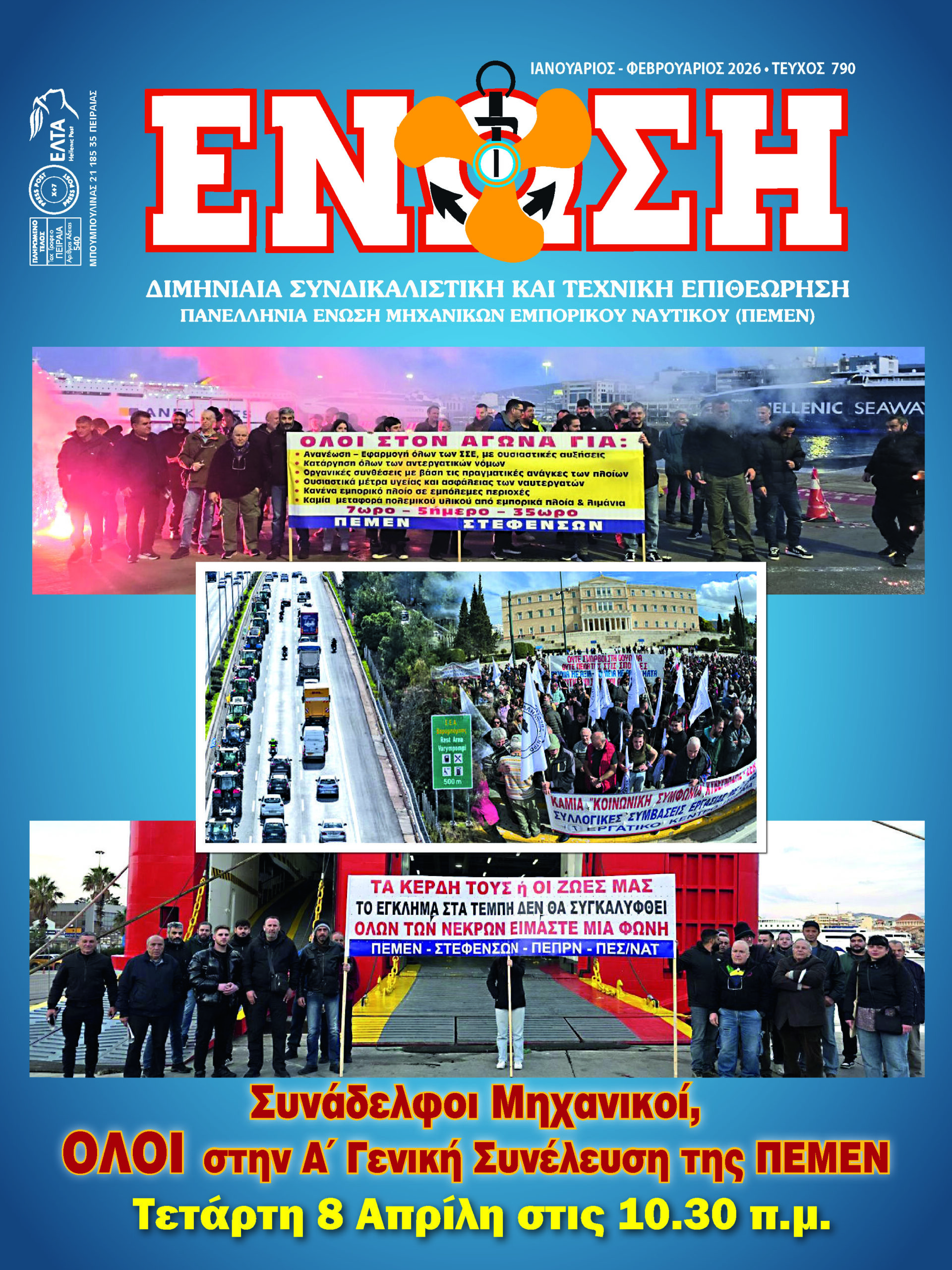 Γενάρης – Φλεβάρης 2026 ΕΝΩΣΗ April 25, 2026 Ενημερώθηκε: April 25, 2026 Από pemen Κοινοποίηση FacebookTwitterPinterestWhatsApp ΠΕΡΙΟΔΙΚΟ ΓΕΝΑΡΗ – ΦΛΕΒΑΡΗ 2026Download Κοινοποίηση FacebookTwitterPinterestWhatsApp ΤΕΛΕΥΤΑΙΑ ΑΡΘΡΑ ΔΕΛΤΙΑ ΤΥΠΟΥ - ΑΝΑΚΟΙΝΩΣΕΙΣ Δόκιμος Πλοίαρχος σε επιστολή του προς τα σωματεία μας, περιγράφει τη ζοφερή πραγματικότητα για τους ναυτεργάτες, στα πλοία που βρίσκονται μέσα στη λαίλαπα του... pemen - April 25, 2026 ΔΕΛΤΙΑ ΤΥΠΟΥ - ΑΝΑΚΟΙΝΩΣΕΙΣ Υπό κατάληψη το M/V πλοίο EPAMINONDAS. Σε ομηρία οι ναυτεργάτες για τις “θρυλικές” μπίζνες των εφοπλιστών! pemen - April 24, 2026 ΝΑΥΤΕΡΓΑΤΙΚΗ Μάρτης – Απρίλης 2026 pemen - April 24, 2026 ΔΕΛΤΙΑ ΤΥΠΟΥ - ΑΝΑΚΟΙΝΩΣΕΙΣ Όλοι στην 24ωρη Πανελλαδική Απεργία την 1η Μάη. Τιμάμε την Εργατική Πρωτομαγιά! Τιμάμε τους νεκρούς της Τάξης μας! pemen - April 23, 2026 Related news ΔΕΛΤΙΑ ΤΥΠΟΥ - ΑΝΑΚΟΙΝΩΣΕΙΣ Δόκιμος Πλοίαρχος σε επιστολή του προς τα σωματεία μας, περιγράφει τη ζοφερή πραγματικότητα για τους ναυτεργάτες, στα πλοία που βρίσκονται μέσα στη λαίλαπα του... pemen - April 25, 2026 ΔΕΛΤΙΑ ΤΥΠΟΥ - ΑΝΑΚΟΙΝΩΣΕΙΣ Υπό κατάληψη το M/V πλοίο EPAMINONDAS. Σε ομηρία οι ναυτεργάτες για τις “θρυλικές” μπίζνες των εφοπλιστών! pemen - April 24, 2026 ΝΑΥΤΕΡΓΑΤΙΚΗ Μάρτης – Απρίλης 2026 pemen - April 24, 2026 ΔΕΛΤΙΑ ΤΥΠΟΥ - ΑΝΑΚΟΙΝΩΣΕΙΣ Όλοι στην 24ωρη Πανελλαδική Απεργία την 1η Μάη. Τιμάμε την Εργατική Πρωτομαγιά! Τιμάμε τους νεκρούς της Τάξης μας! pemen - April 23, 2026